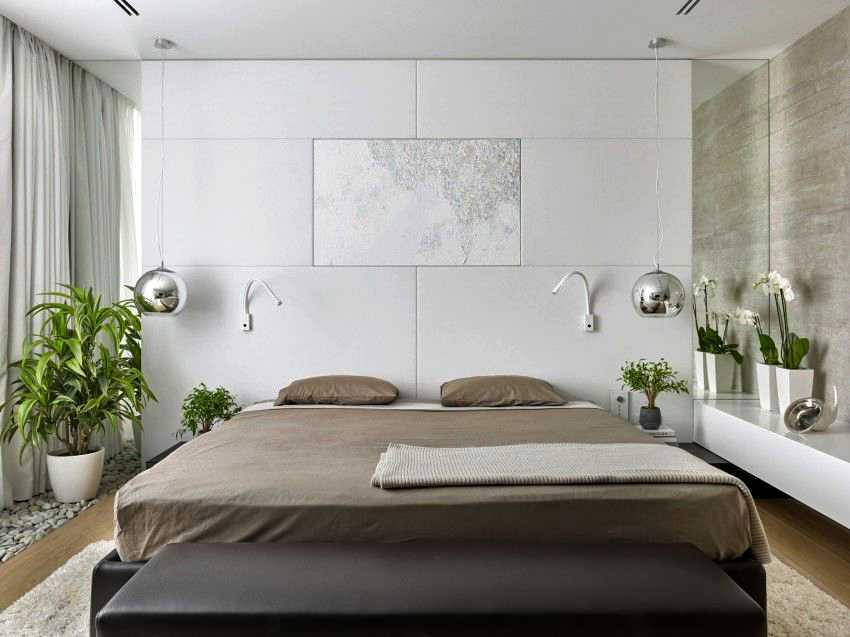 Бежевое тканевой изголовье идеально подойдет под современный интерьер спальни