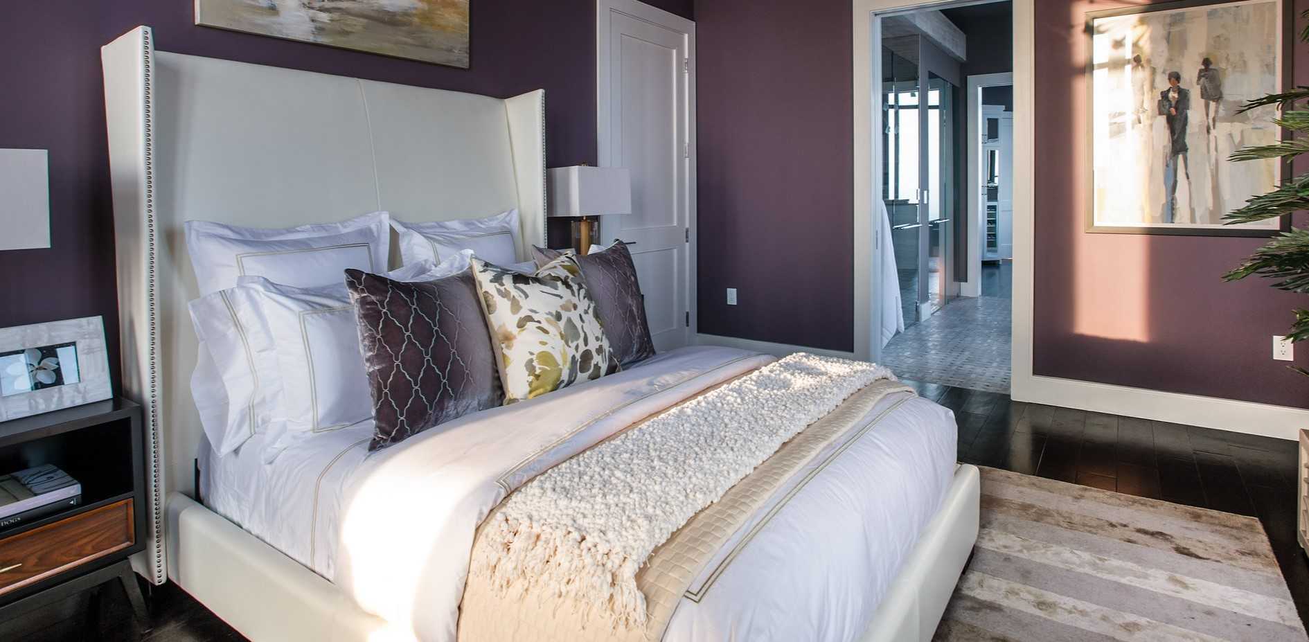 Белая кровать с высоким изголовьем стильно смотрится на фоне фиолетовой стены