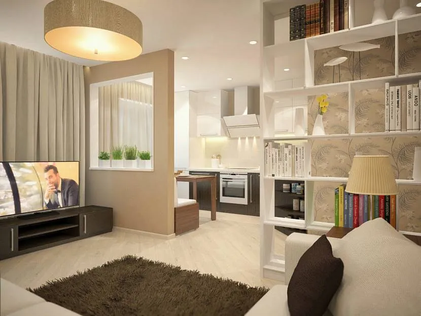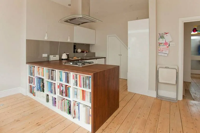 В интерьер кухни-гостиной или кухни-столовой гармонично впишется шкаф или стеллаж. Такая перегородка станет удобным местом для хранения кухонных принадлежностей.
