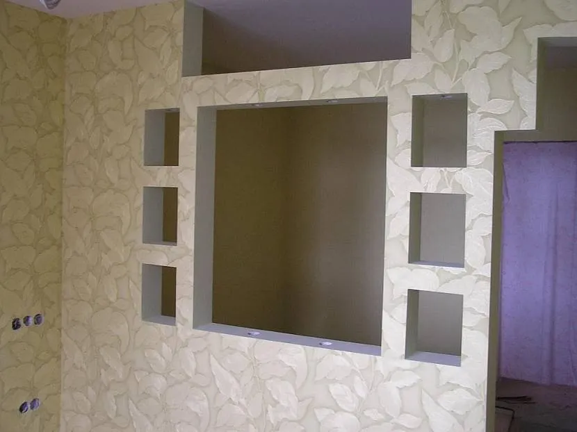 В прямой перегородке из гипсокартона может разместиться стеллаж для декоративных аксессуаров, приглушенное освещение ниш добавит комнате таинственностиИсточник peregorodkainfo.ru