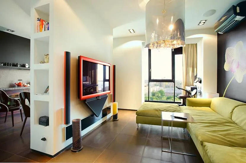 Перегородка из гипсокартона отлично делит пространство между гостиной и прихожей, яркая раскраска делает конструкцию притягательной и оригинальнойИсточник design-homes.ru