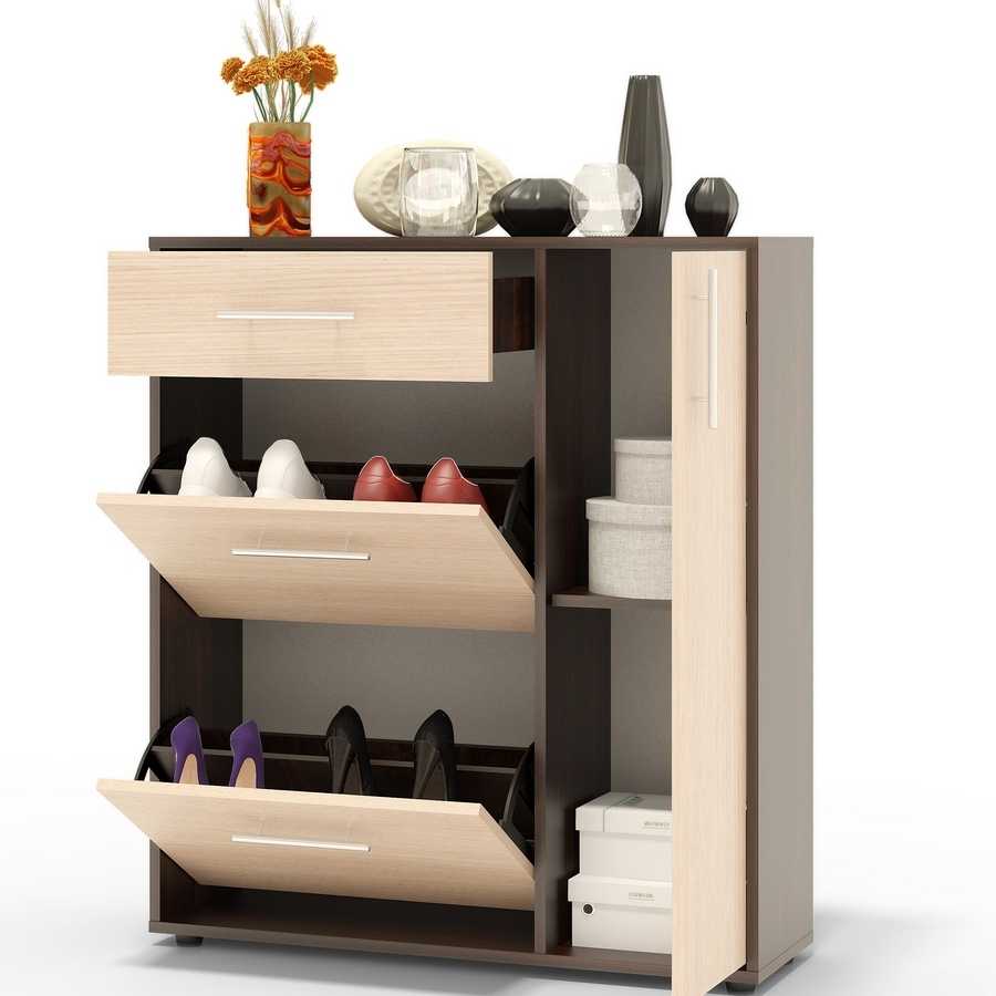 Такие конструкции считаются максимально удобными: при открытии отлично видно все содержимое отсека. Для того, чтобы достать обувь из нижнего яруса, не нужно сильно нагибаться, достаточно протянуть руку. Работают конструкции бесшумно, открываются легко, без усилий. Дверцы защищают обувь от пыли, влаги – случайных брызг с зонта или одежды.