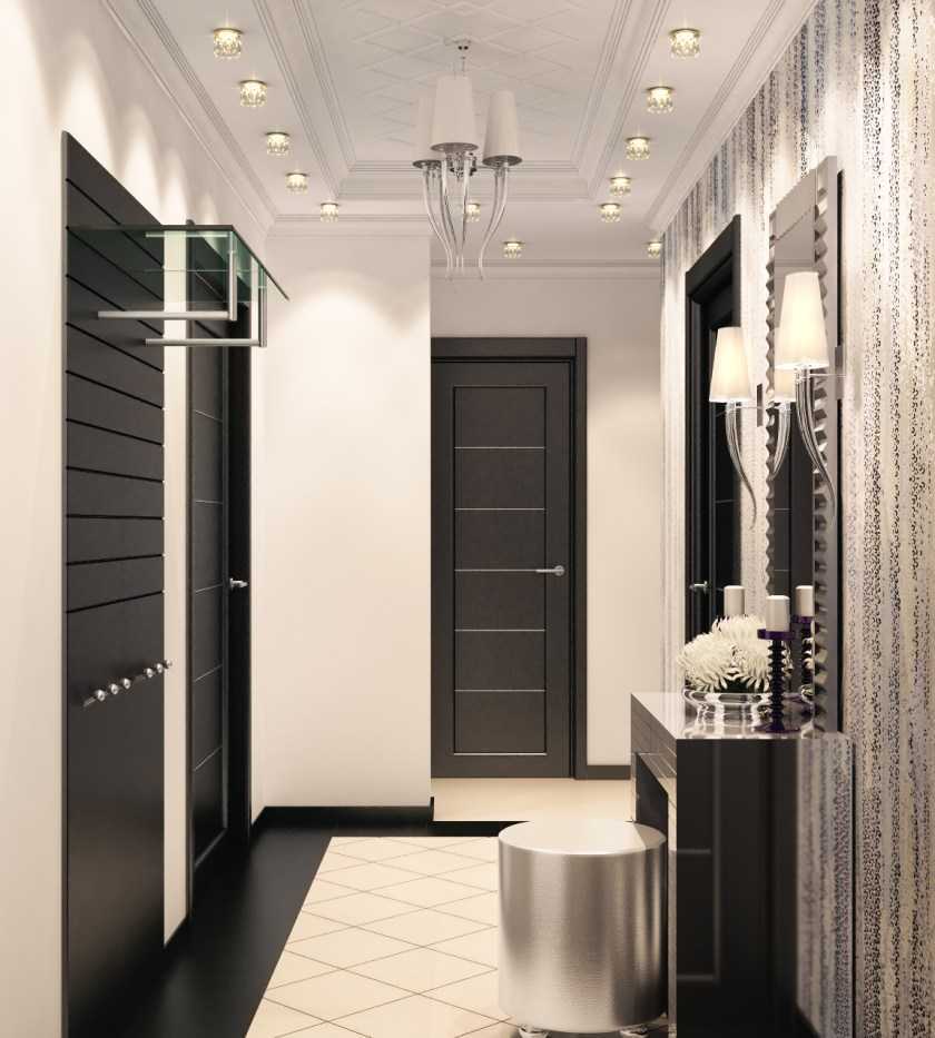 В оформлении коридора приветствуются идеально гладкие и ровные светлые поверхности, а также стеклянные, металлические или глянцевые пластиковые покрытия.