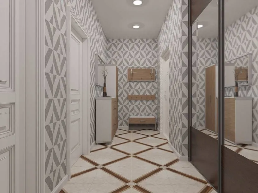 Можно постелить ковер с оригинальным рисунком. Такой же узор наклеить на стену и потолок. Качественные стеновые панели и зеркальная стена — идеальные варианты оформления интерьера прихожей.