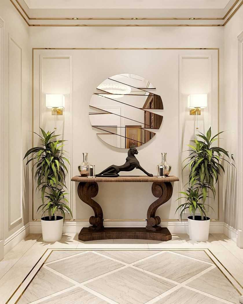 — Стены прихожей в классическом стиле преимущественно светлых и бежевых оттенков. Чтобы комната не выглядела бледной, можно использовать цветочные рисунки или декоративные рамы в отдельных участках. Некоторые, чтобы еще больше подчеркнуть свое богатство, могут оббить стены красивой тканью или провести отделку стен деревянными панелями.