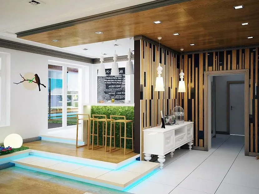 Однако потолки из гипсокартона не менее функциональны, что обусловлено возможностью монтировать в них огромное количество точечных светильников и светодиодной ленты. Если у жильцов нет желания затевать грандиозные перемены в квартире, потолок можно оштукатурить и выкрасить в светлый цвет.