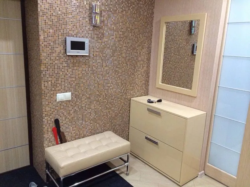 На фото прихожая со стеной, декорированной золотистым мозаичным рисунком.