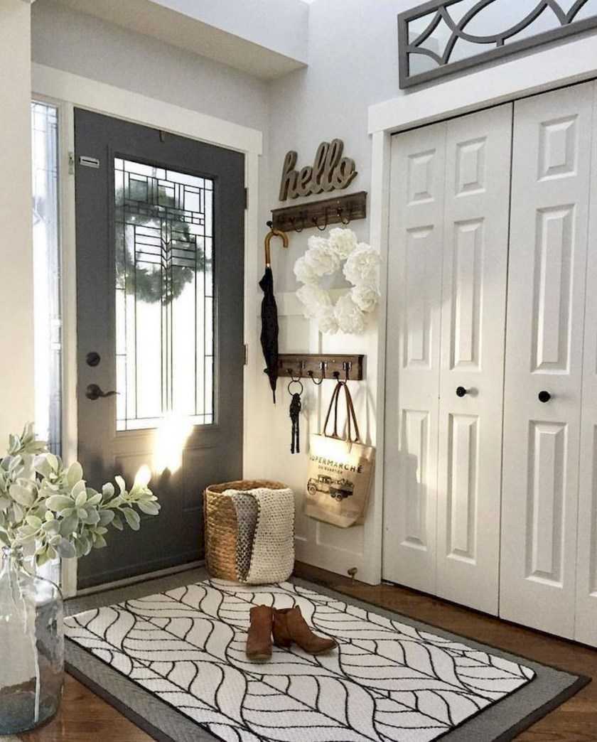 Небольшой напольный ковер сделает просторную прихожую немного уютнее