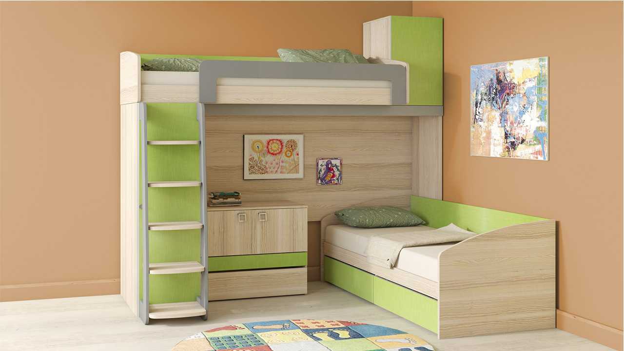 - детские кровати в два этажа с перпендикулярным расположением спальных ложе;