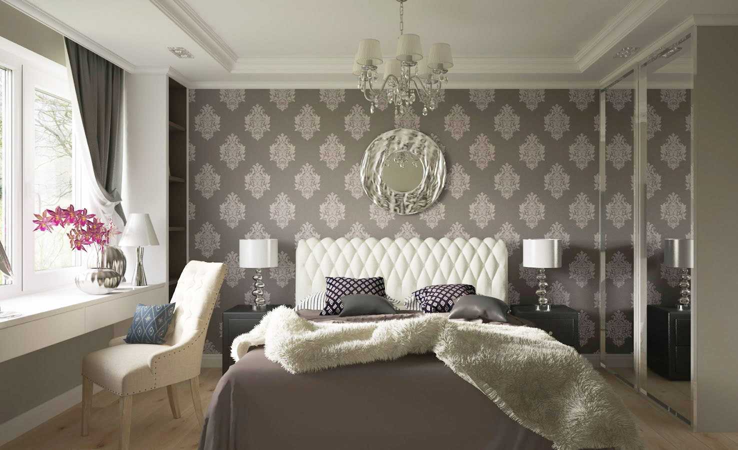Фото 1. Серые обои с темным вензельным рисунком прекрасно подходят для спальни в классическом стиле.