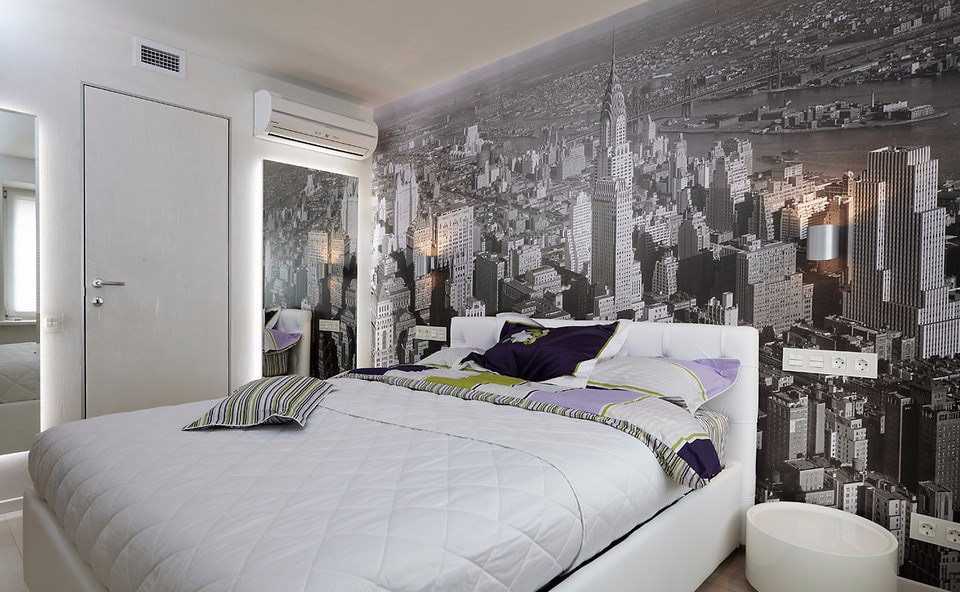 Фото 3. Фотообои на стене в серой гамме дополнены сиреневым текстилем.