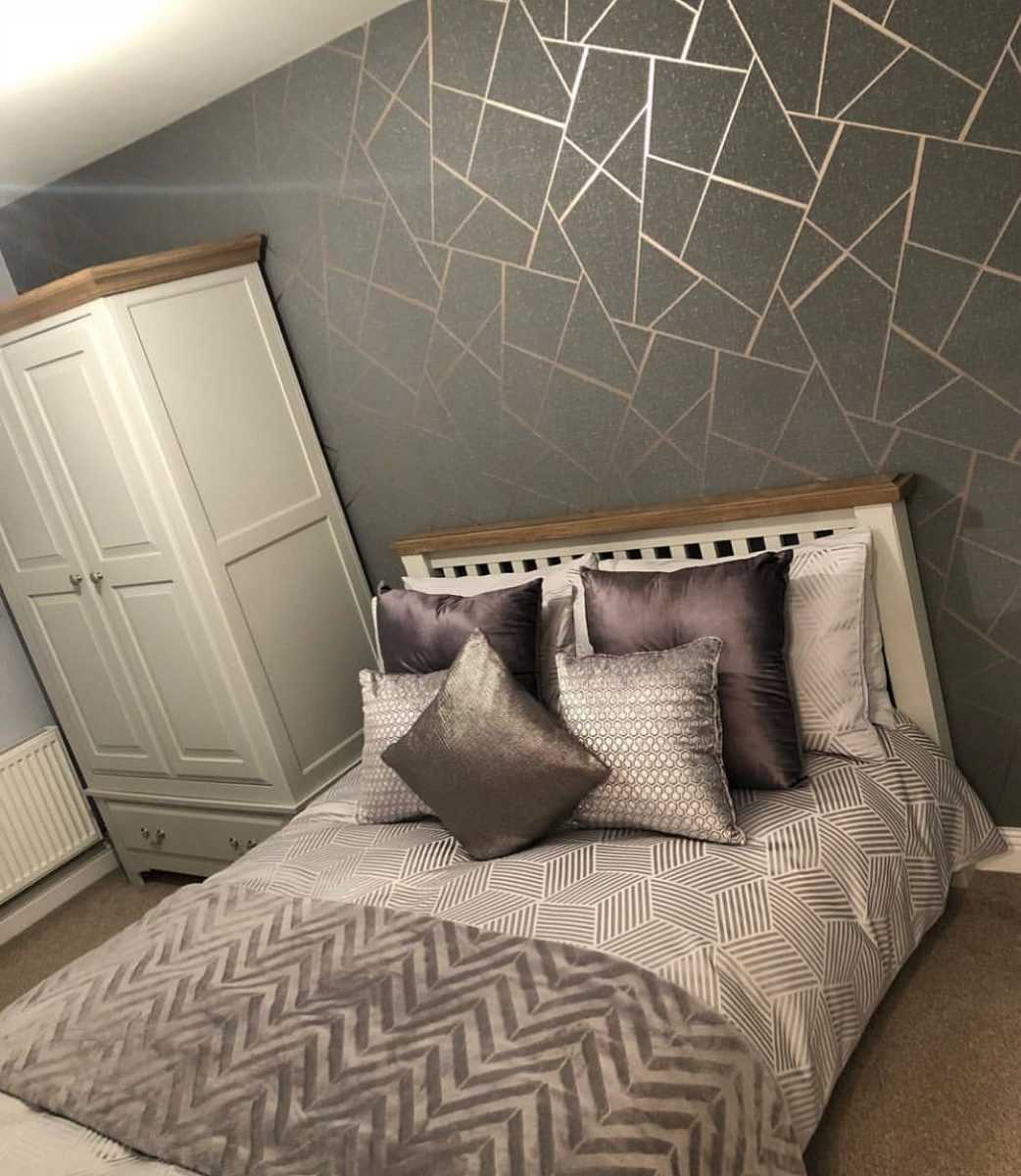 На фото серые обои с геометрическим принтов в сочетании с розовым текстилем в интерьере небольшой спальни.