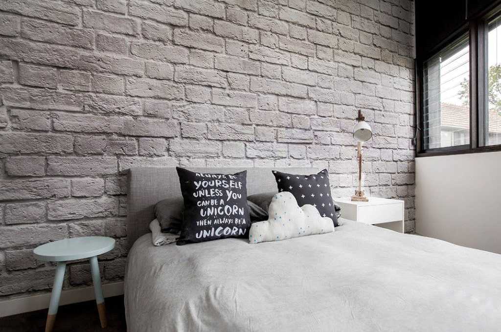 Фото 5. Серые обои под кирпич – основа стиля в этой спальне. Она монохромна, единственное исключение – нежно-голубой табурет в роли одной из прикроватных тумб.