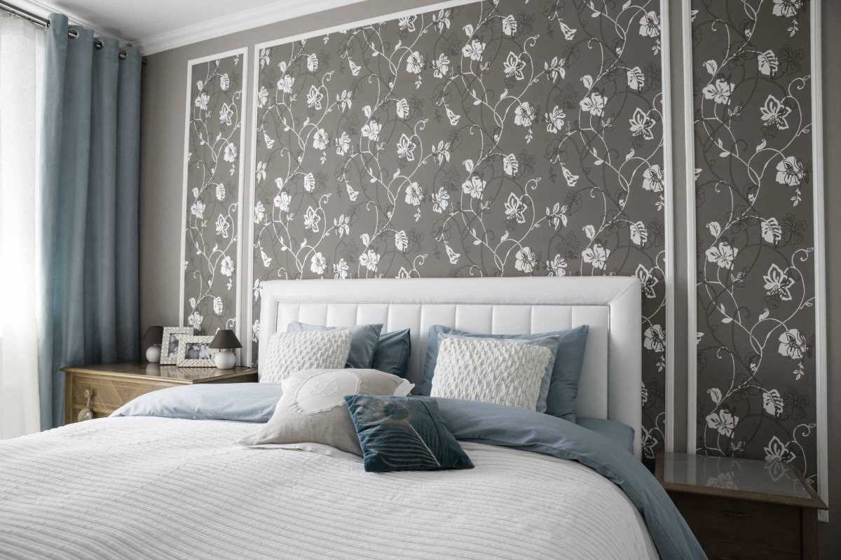 Фото 2. Белые цветочные узоры на серых обоях создают спокойный фон, глубокий фиолетовый цвет изголовья кровати придает глубину и выразительность интерьеру.