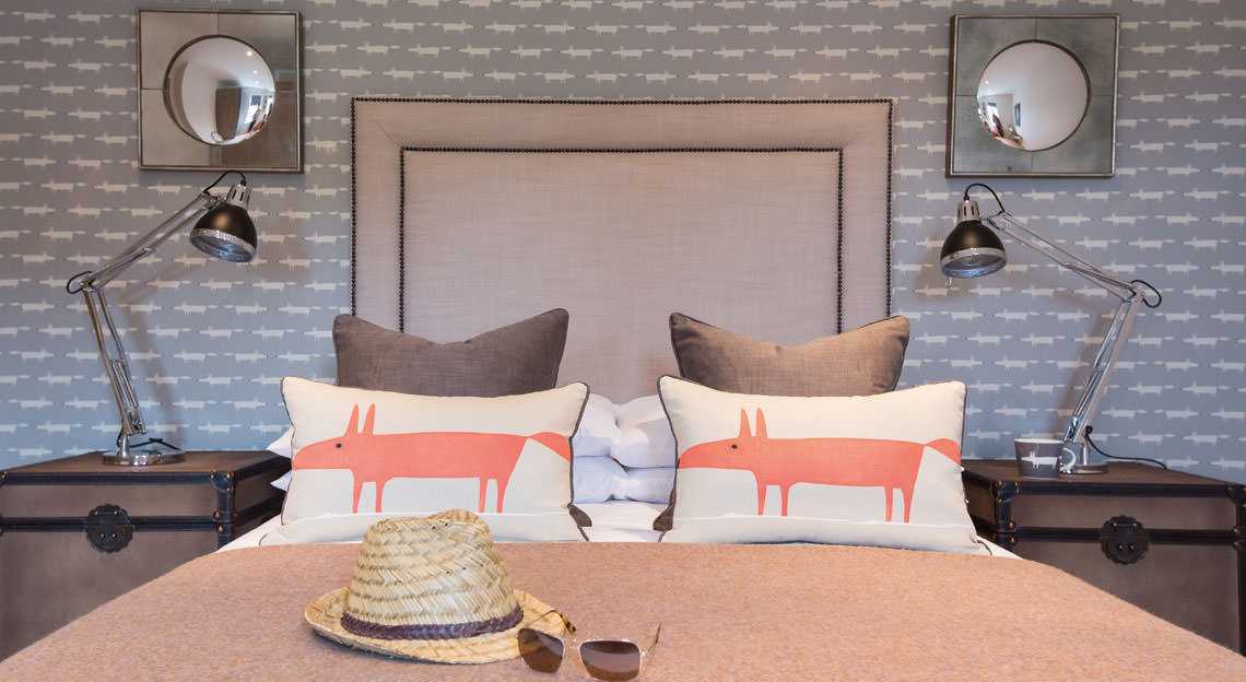 Фото 10. Серые обои «под кирпич» выделяют стену у изголовья.