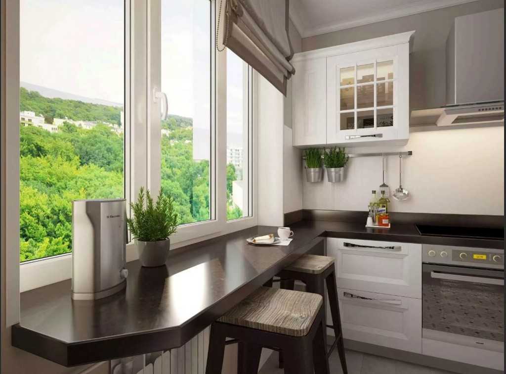 Оригинальным решением для интерьера кухни с балконом-продолжением станет использование подоконника как барной стойки. Это позволит не только внести в интерьер нужную атмосферу, но и разбить пространство на зоны. Барная стойка станет дополнительным функциональным пространством или перебрать на себя функцию обеденного стола (если кухня малогабаритная).