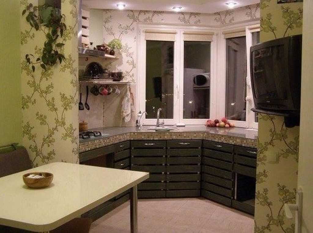 На фото кухня площадью 9 кв м с небольшим телевизором на стене.