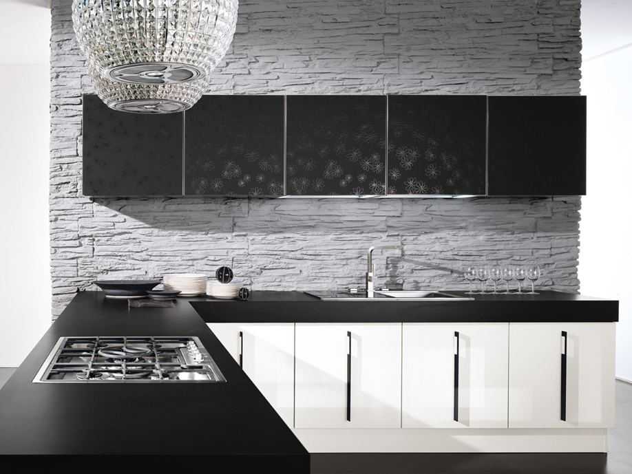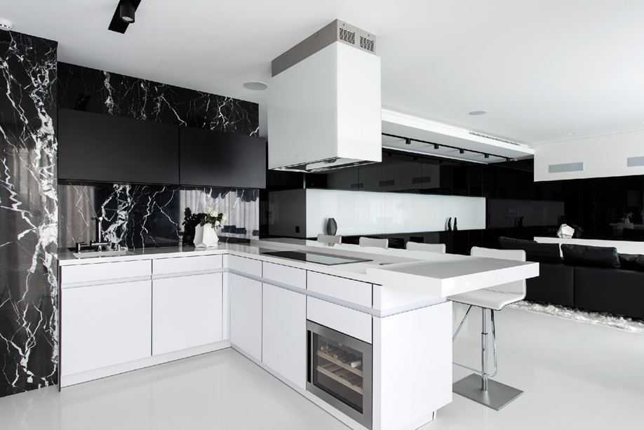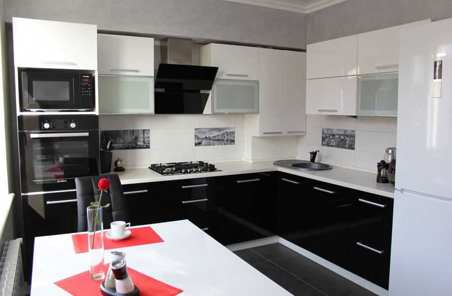 Чисто белые кухни давно утратили свою популярность. Им на смену пришли более стильные варианты меблировки, в котором сочетается два контрастных цвета – светлый и темный. Самое беспроигрышное решение в оформлении черно-белой кухни – выстроить оттенки по горизонтали – черный верх и белый низ, или наоборот – белый верх и черный низ. Элегантно смотрится кухонный интерьер с белой мебелью и черным фартуком. Его дополняют декоративными вставками, светодиодной подсветкой или софитами.