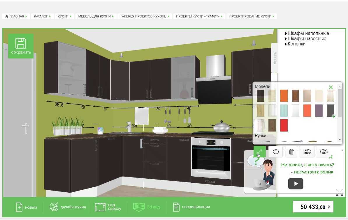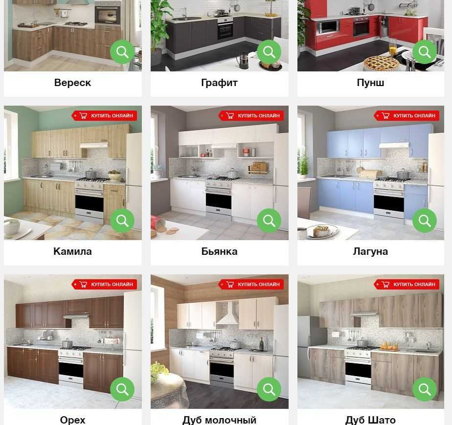 Сразу открывается галерея проектов, где представлены варианты фасадов будущей кухни. Что вам больше по душе — васаби или слива, шоколад или капуччино, вереск или дуб, орех или сосна? Больше двадцати различных решений!