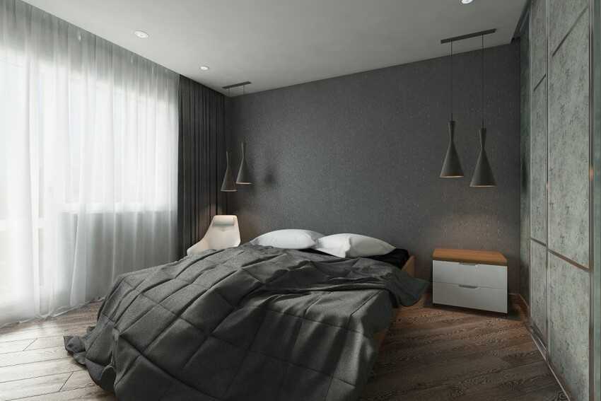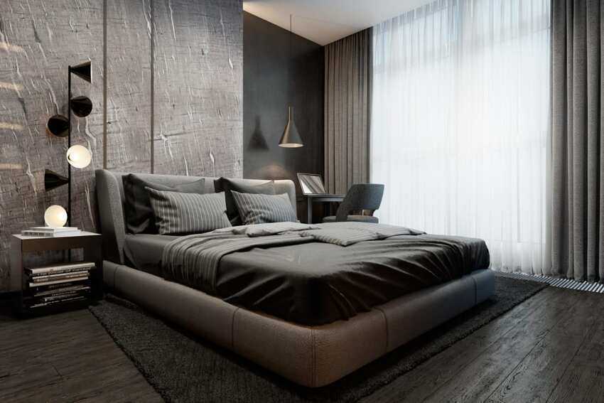 Спальня оформляется как серый монохром, а затем разбавляется при помощи различных текстур и мебели.