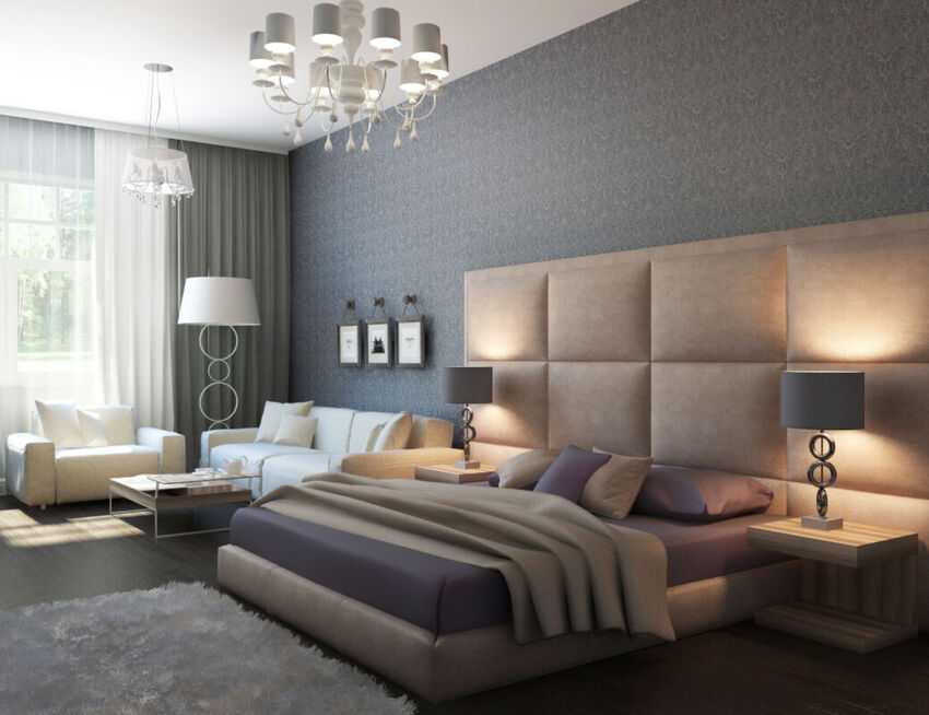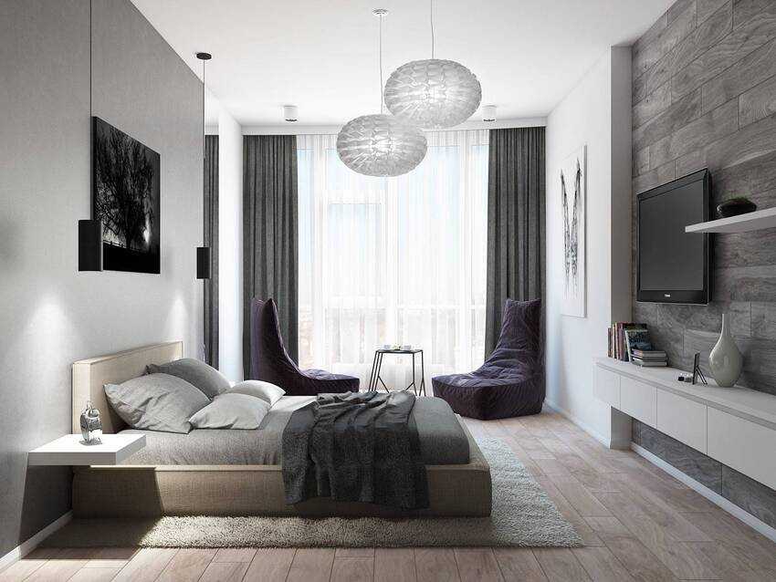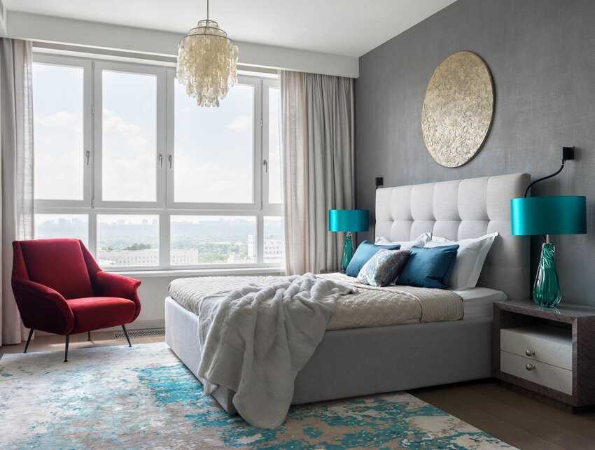 Современная спальня не приветствует монохром, поэтому серый здесь может быть одним из тонов в комбинации с другими цветами.