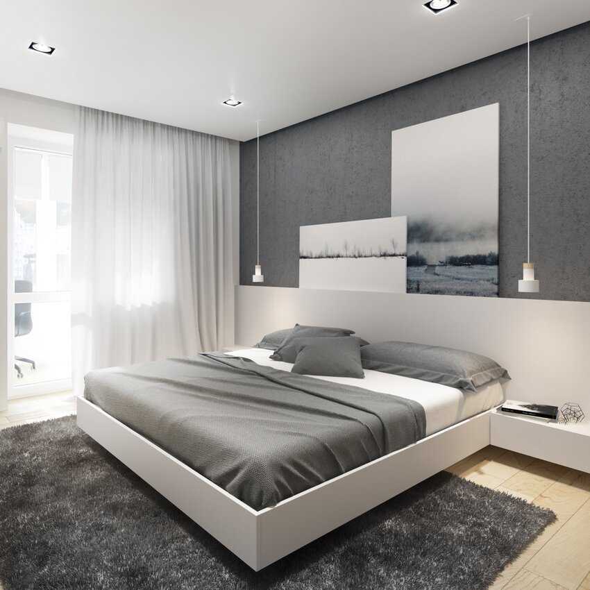 На фото серо-бело-черная спальня, выдержанная в минималистичном стиле.