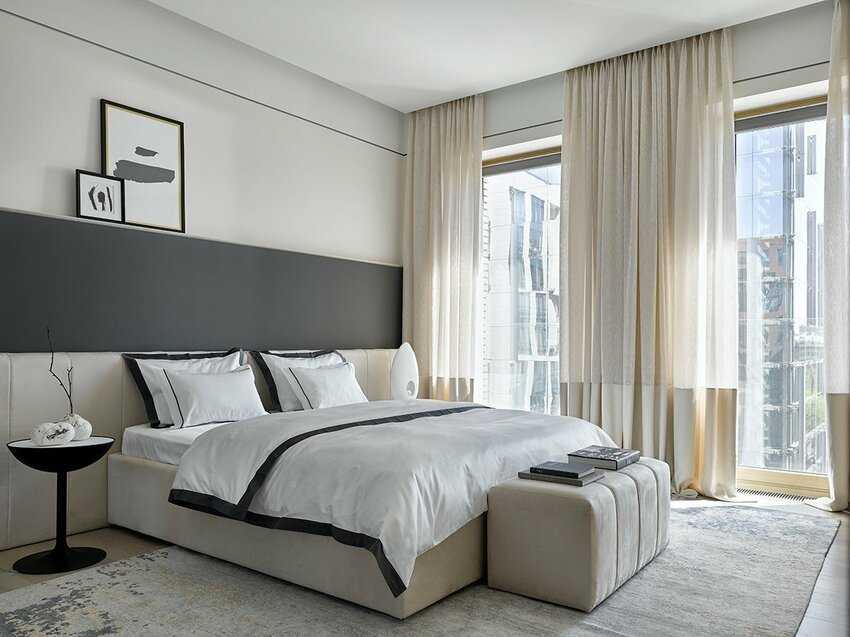 Такую комбинацию применяют, чтобы создать нейтральный и монохромный дизайн. Неброская, спокойная и элегантная бежевая палитра в спальне помогает нивелировать строгий серый цвет и лишить комнату мрачности.