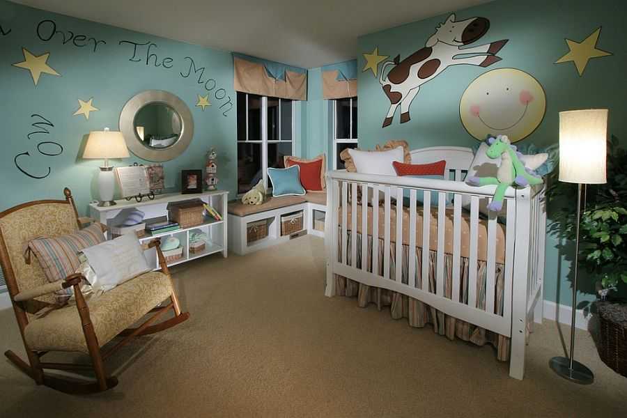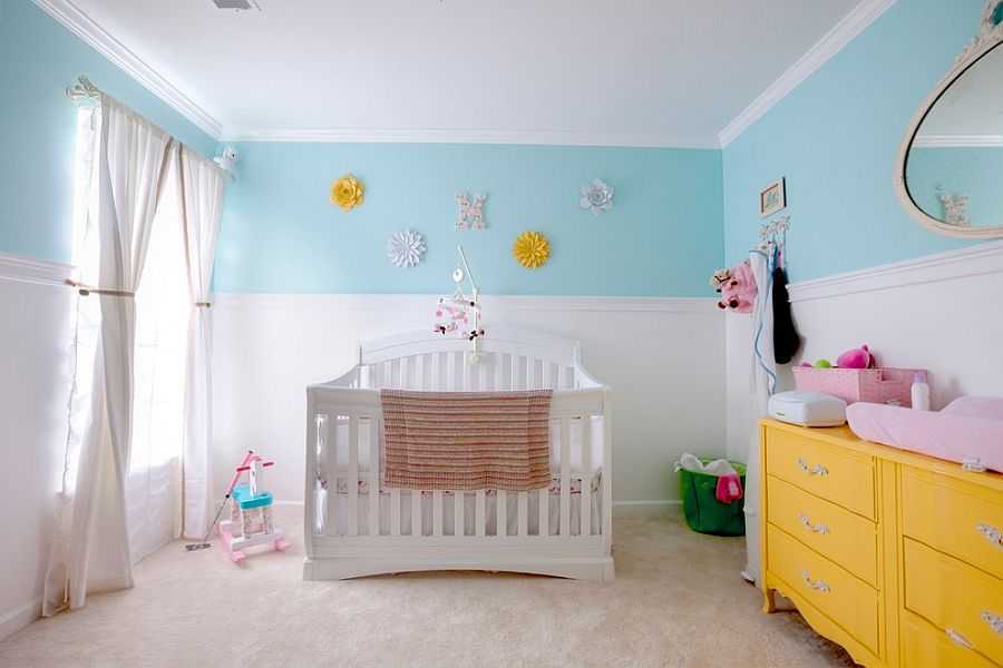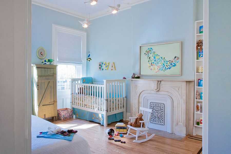 Идеально подойдет сочетание теплого голубого оттенка с яркими контрастными элементами для оформления детских комнат.