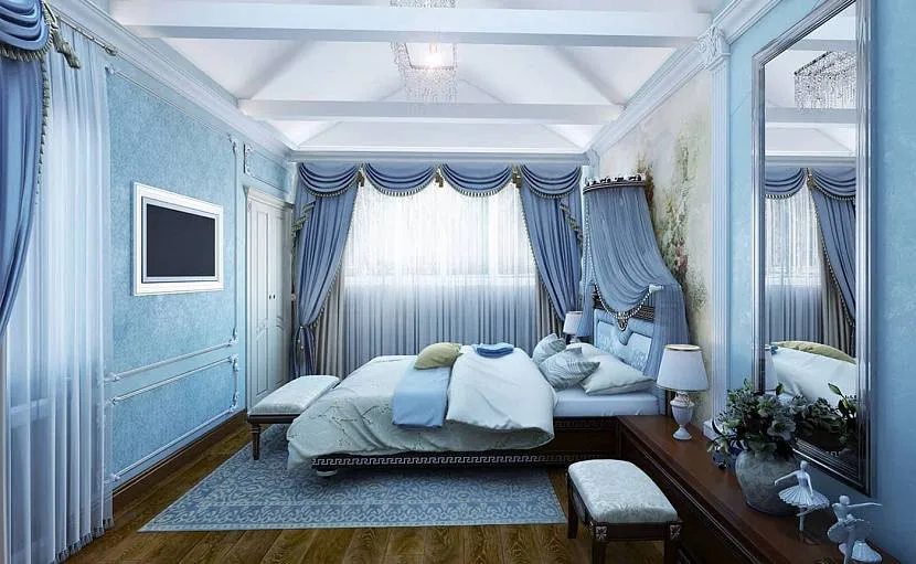 Классическое направление. Для него характерна темно-синяя спальня, она может быть дополнена золотистыми тонами. Здесь уместной будет старинная резная мебель, картины в деревянных рамах. Синей может быть не только отделка стен, но и мебель – кресла с высокой спинкой, декорированные извивистыми узорами.