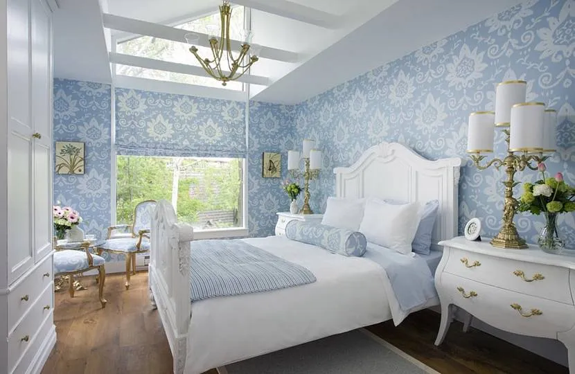 Прованс. Это выбор поклонников французской романтики. Чтобы спальня в синих тонах стала максимально изысканной, используют обои нежных небесных тонов. Легкий и воздушный текстиль обязательно должен быть декорирован цветочными мотивами.
