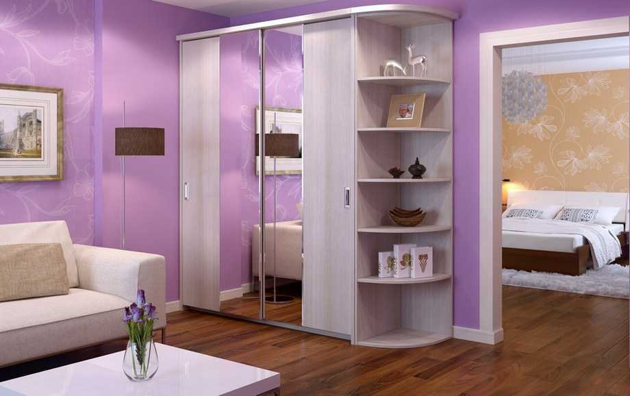 - радиусные купе очень привлекательны, они отличаются наличием вогнутых или выпуклых дверок, но такой вариант подходит для больших помещений, где мебель этого вида придаст интерьеру больше индивидуальности;
