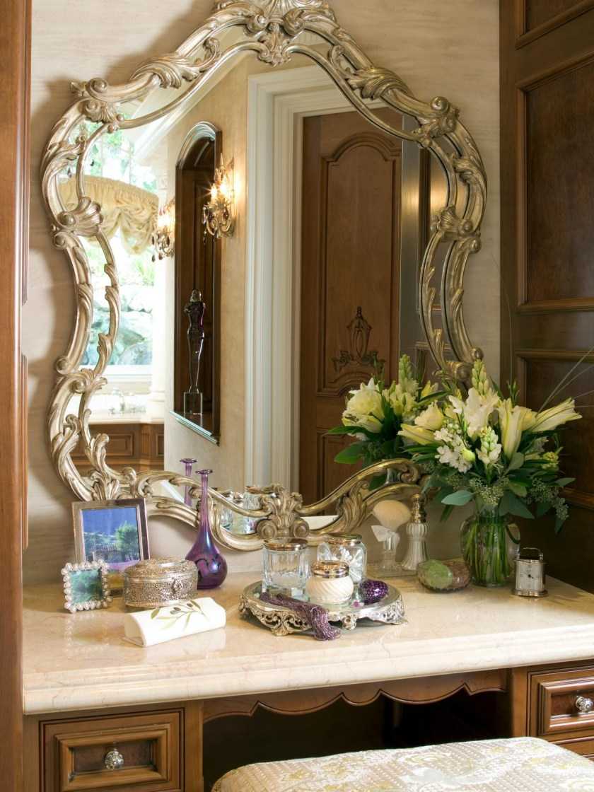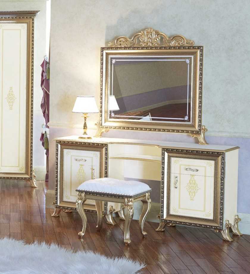- столешницей с двумя тумбами сбоку, её зеркальная поверхность обрамлена богатой рамой;