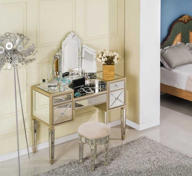 Для малогабаритных квартир очень удобен угловой туалетный столик с зеркалом в спальню, который займёт пустующий угол, освободив пространство.