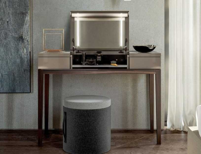 Вместе с творческими задумками дизайнеров меняются материалы, фактура, декор фасадов. Но вместе с тем, изменения касаются внутреннего содержимого. Ввиду постоянного стремления современных дизайнеров к использованию «умной» мебели для спальни, трюмо оборудуют дополнительными выдвижными ящиками, отсеками, складными зеркалами.