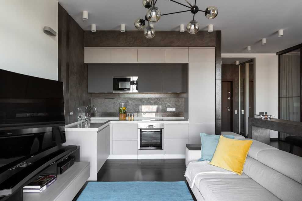 Но и малогабаритки подходят для совмещения двух смежных комнат. Как уже говорилось выше, в таких квартирах должна стоять мощная вытяжка, которая не позволит запахам впитаться во все частички маленького помещения. Небольшие однокомнатные квартиры-студии станут отличным жильем для молодой пары без детей или холостяка, который пока не стремится связать себя долгими отношениями, а значит не нуждающемся в постоянных марафонах по приготовлению блюд на большую семью. Модные дизайны интерьера маленькой кухни представлены на фото.