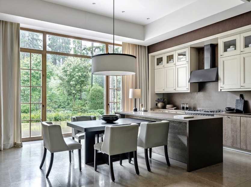 - обеденную зону (столовая) — место для приема пищи членами семьи и гостями. На ней располагаются обеденный стол, стулья, а также барная стойка. Здесь фантазии по планировке и виду стола со стульями может сдержать только бюджет;