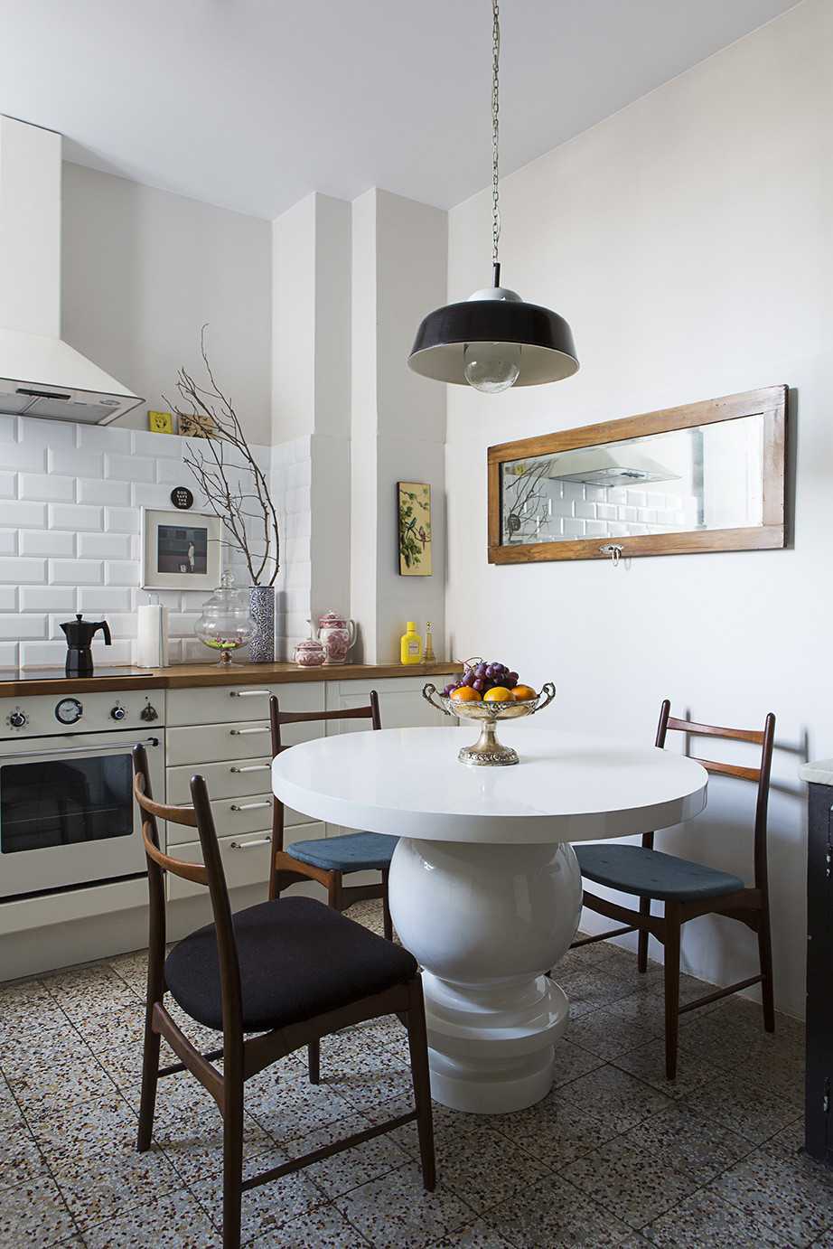 Круглый обеденный стол смотрится очень изящно в интерьере маленькой кухни и занимает немного места