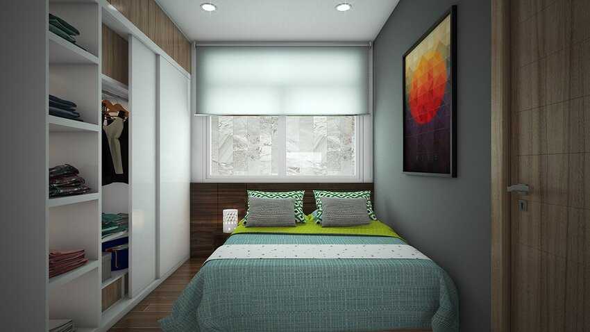 Если дверь и окно размещены на коротких стенах и находятся напротив друг друга, кровать можно поставить изголовьем к окну. Это даст возможность установить шкаф около двери.