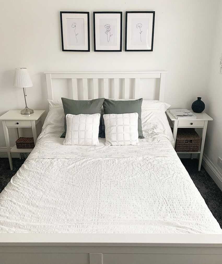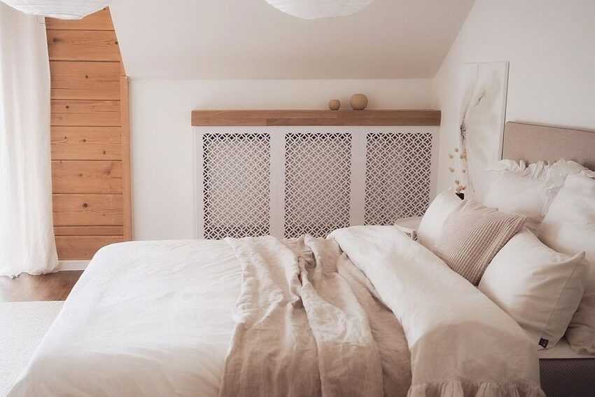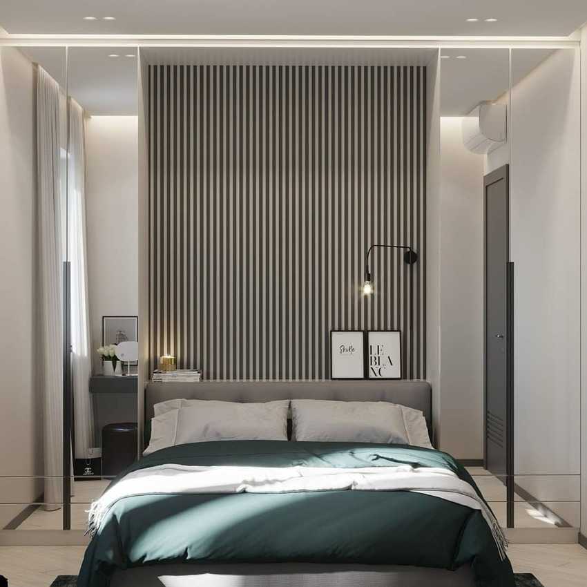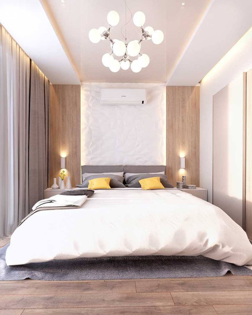 Этот вариант — отличный дизайн для маленьких спален, так как он позволяет делать пространство уютным и сохранять при этом выдержанность традиций минимализма.