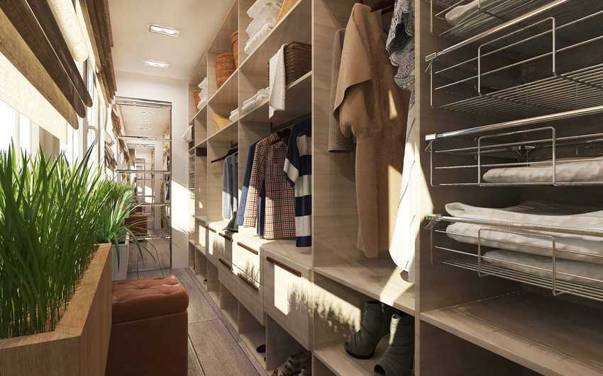Полки и навесные полки органично вписываются в такое пространство. Чтобы расставить одежду, выберите высокий и узкий стандартный или встроенный шкаф. Они и будут смотреться современно и стильно, и сэкономят место.
