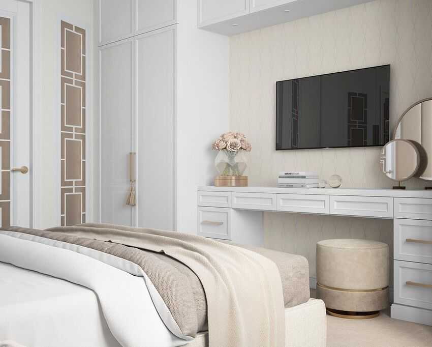 В результате, спальня станет более просторной, а освободившуюся площадь может занять компактное кресло, туалетный столик или стильный напольный светильник.