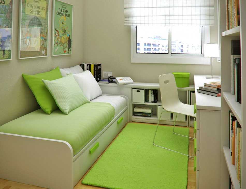 Вся мебель в комнате должна быть компактной и многофункциональной. Например, шкафы следует выбирать узкие, а кровати с дополнительными полками и выдвижными ящиками.