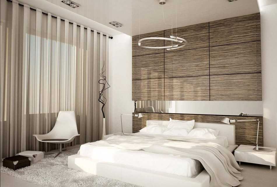 Современное направление не предполагает обилия декоративных вещиц. Достаточно будет нескольких стильных светильников, пары картин на стенах и красивого покрывала на кровати.