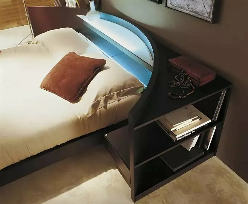 - Если прикроватные тумбочки поставить некуда, то можно приобрести кровать со встроенной полкой и тумбами в изголовье.