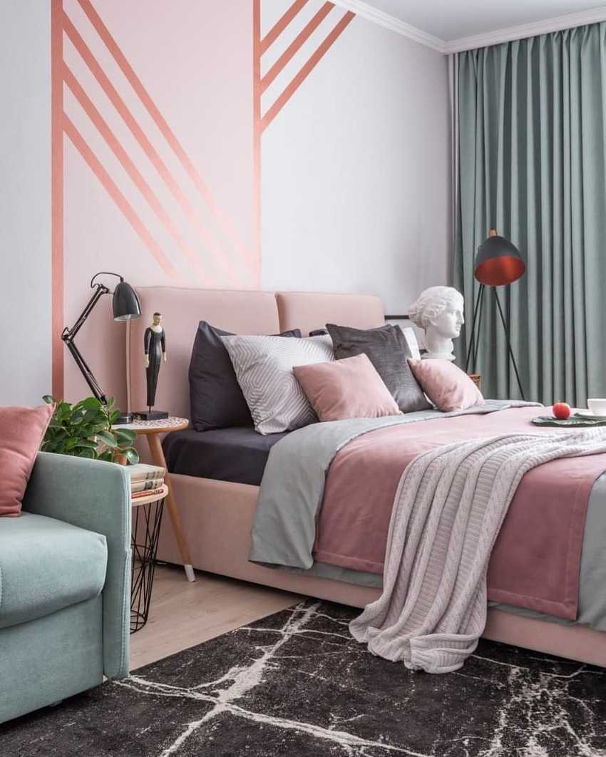 Лососевый оттенок розового – настоящая «фишка» 2019 года во всех интерьерах. Он выгодно отличается от привычного кукольного и уже наскучивших пыльных и пепельных оттенков. Особенно хорош он для романтических спален в сочетании с бирюзовым или темным серо-голубым.