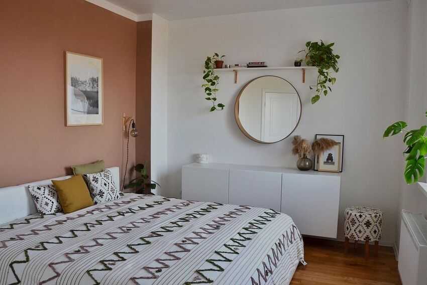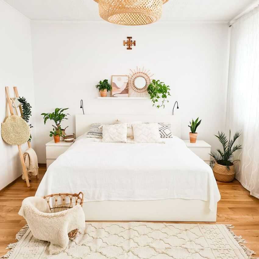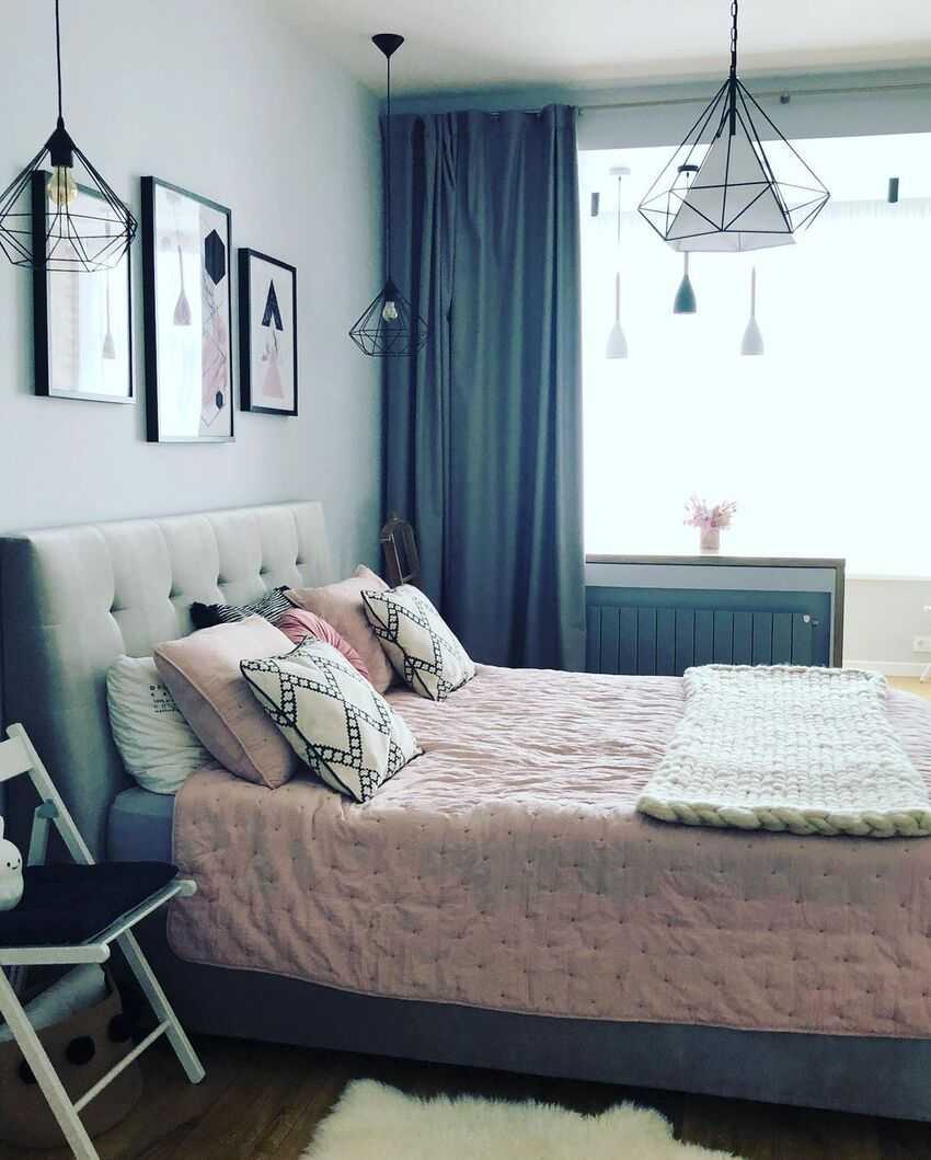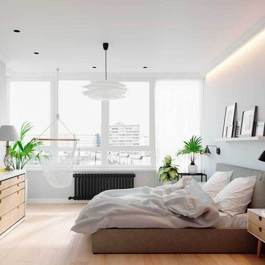 В спальне в скандинавском стиле используется минимальное количество мебельных предметов, не перегружающих и не занимающих свободное пространство. Например, гардероб можно заменить открытой вешалкой, а прикроватные тумбочки — маленькими столиками, полками или табуретками.