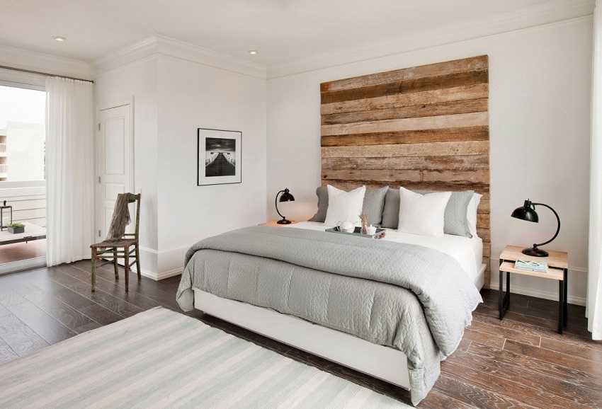 Дерево является самым распространенным вариантом отделки в скандинавском стиле. Его применяют для оформления акцентной стены, пола, дверей и окон. Деревянные поверхности могут использоваться в первозданном виде, без специальной обработки. Их зачастую покрывают лишь прозрачным лаком. Удачные решения показаны на фото дизайна маленькой спальни в скандинавском стиле.