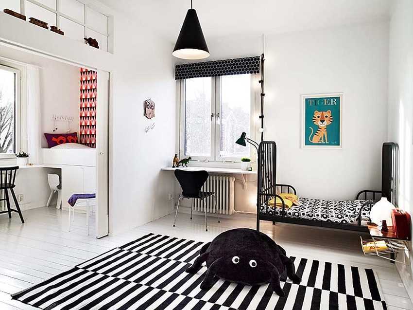 Светлый фон оформления стен, характерный для скандинавского стиля, как нельзя лучше подходит для детской комнаты. В таком случае возникает возможность продемонстрировать яркие детали, подчеркнув их значимость.