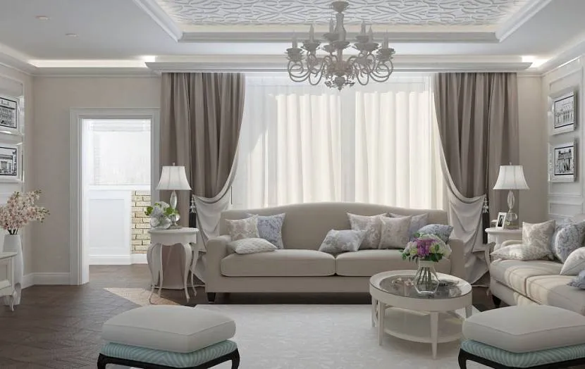 Для квартиры подойдет отделка стен декоративной штукатуркой. Потолок лучше побелить и повесить на него тяжелую люстру со стеклянными или хрустальными подвесками. В них будет красиво играть свет.
