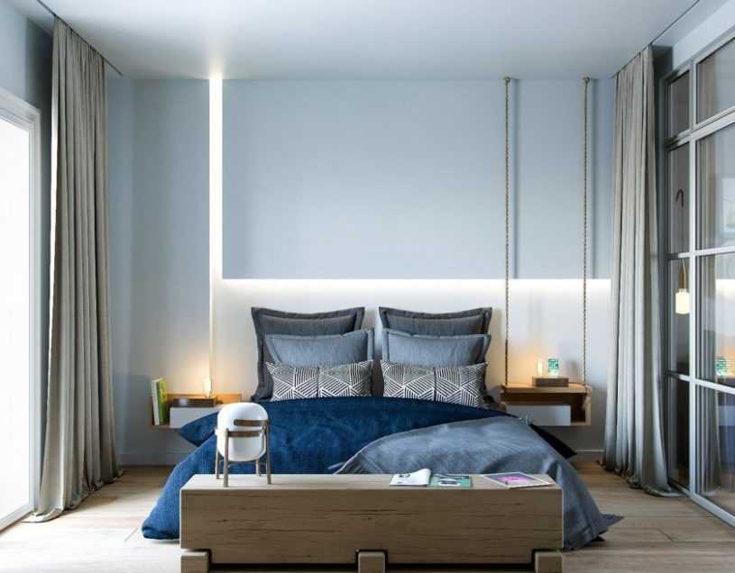 Натуральные материалы и холодные оттенки в интерьере вместе с использованием мебели из светлой древесины позволят добиться эффекта расширения пространства. Это направление предполагает монохромное оформление без декора, где важно подобрать подходящий текстиль на кровать и для обивки мебели.